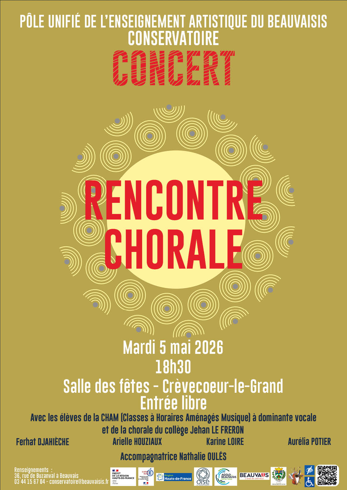 Assistez à un moment musical incroyable, un concert qui réunira les élèves de classe à horaires aménagées musique à dominante vocale de Ferhat DJAHIECHE, ainsi que les élèves de Maxence FONTAINE (intervenant musique à l’école Henri VILLETTE), Arielle HOUZIAUX (professeure d’éducation musicale et chant choral au collège), Karine LOIRE (professeure des écoles) et Aurélia POTIER (professeure des écoles). Cette rencontre de chorale va enchanter votre soirée.
